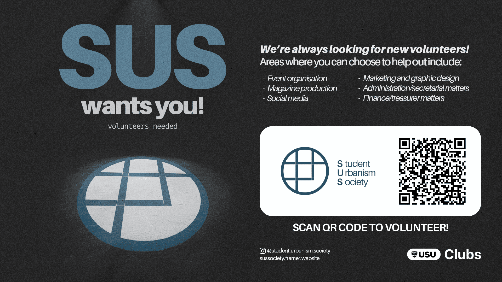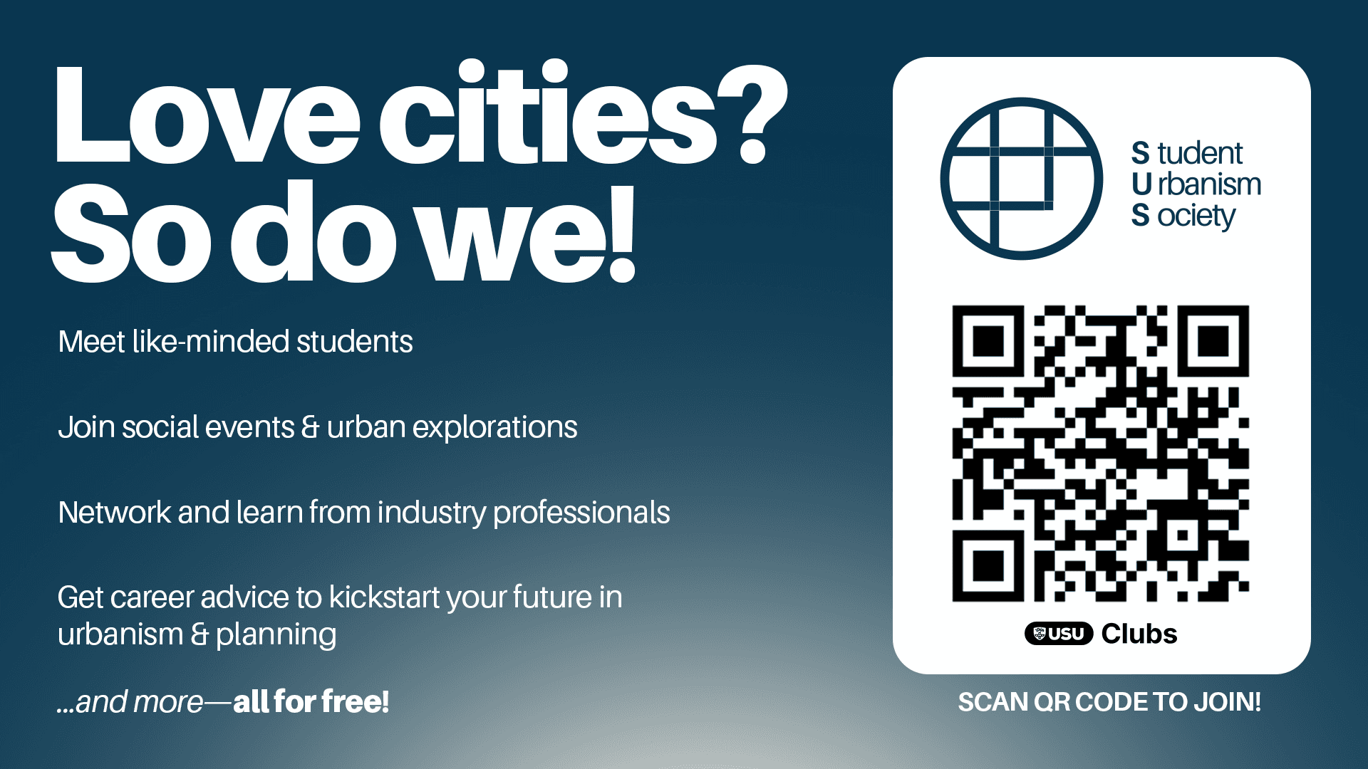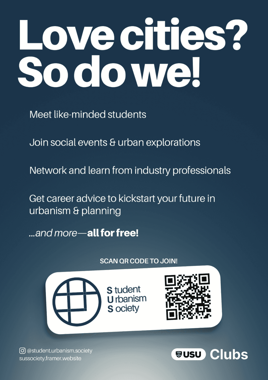 A key consideration for these marketing materials was how to attract students beyond the niche of urbanism, a postgrad major within Architecture, which can limit the society's reach. I led with the copy “Love cities? So do we!”, a simple, inviting hook that extends what the society is about.